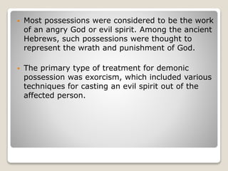 Thought to be a witch. C performing an exorcism. If a person wants a career focused on detecting assessing and treating abnormal patterns of functioning that person should consider becoming a clinical.